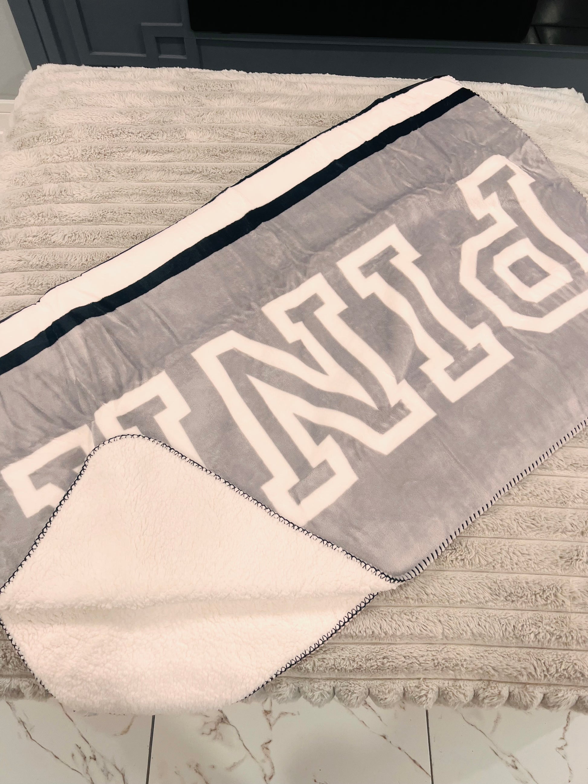 Get wrapped up in ultimate comfort with this generously sized 50inch by 60inch sherpa blanket that's pure luxury on both sides. One side features cozy sherpa warmth while the other boasts soft plushiness—double the coziness, double the love! The large "Pink" logo makes a sweet statement, perfect for snuggling on the couch, movie nights, or gifting to your favorite pink lover. This blanket is basically a warm hug you can wrap around yourself!